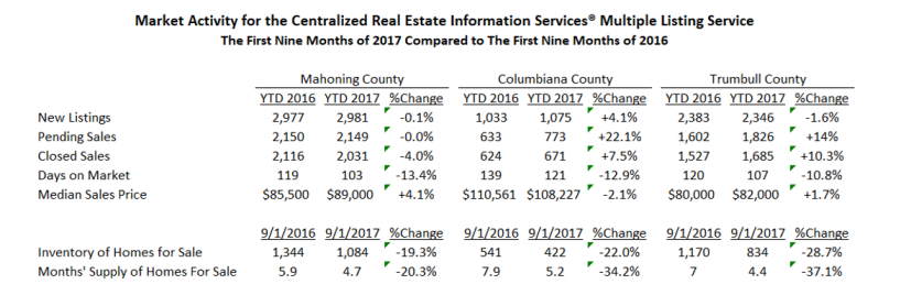 A summary of the housing market statistics follows for Mahoning, Columbiana, and Trumbull Counties, comparing the first nine months of 2017 with the same period last year.